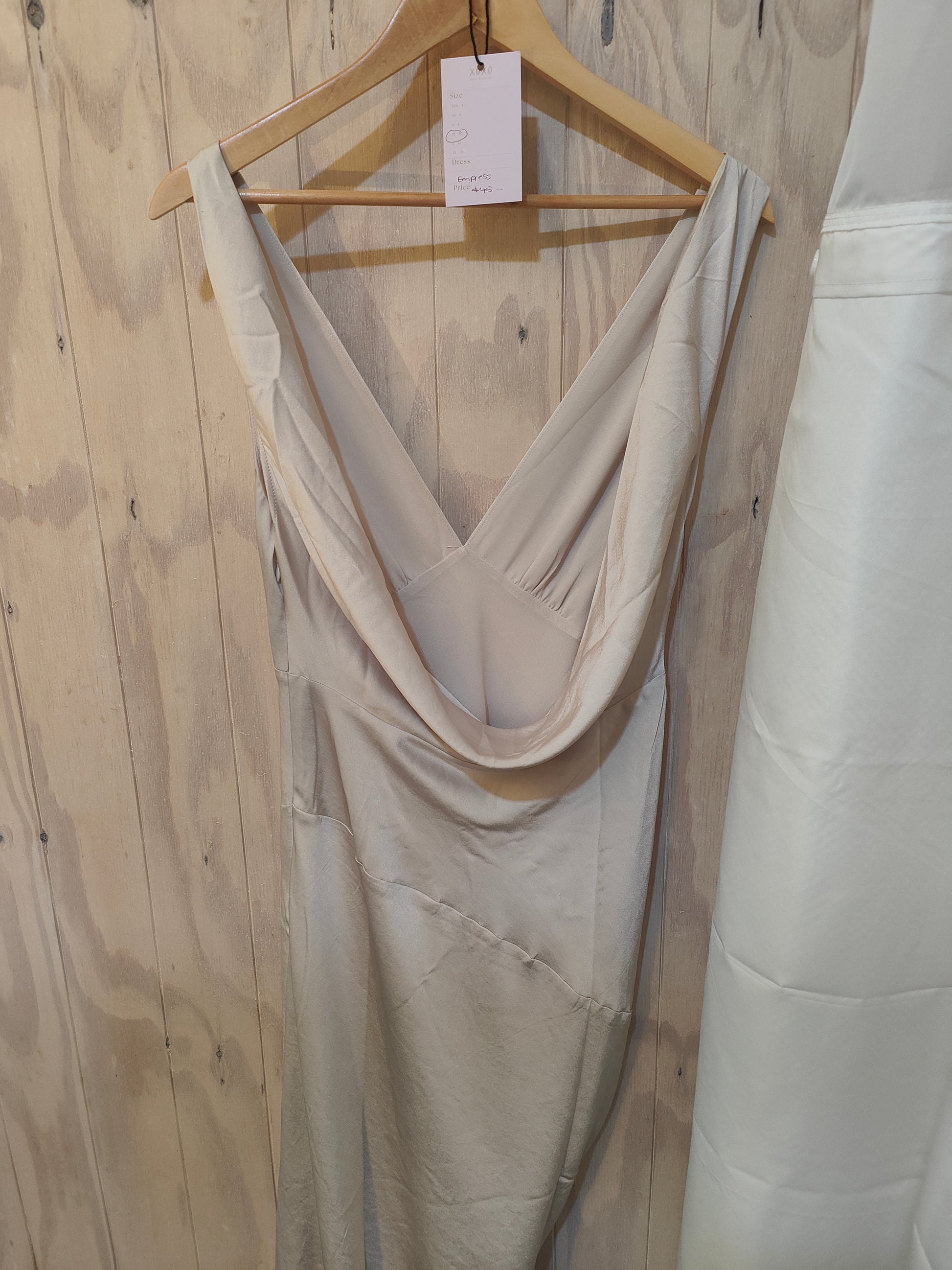 Featuring a V-neckline that highlights the décolletage and a breathtaking low cowl back that adds an unexpected touch of drama, this dress combines modern luxury with vintage-inspired charm.
