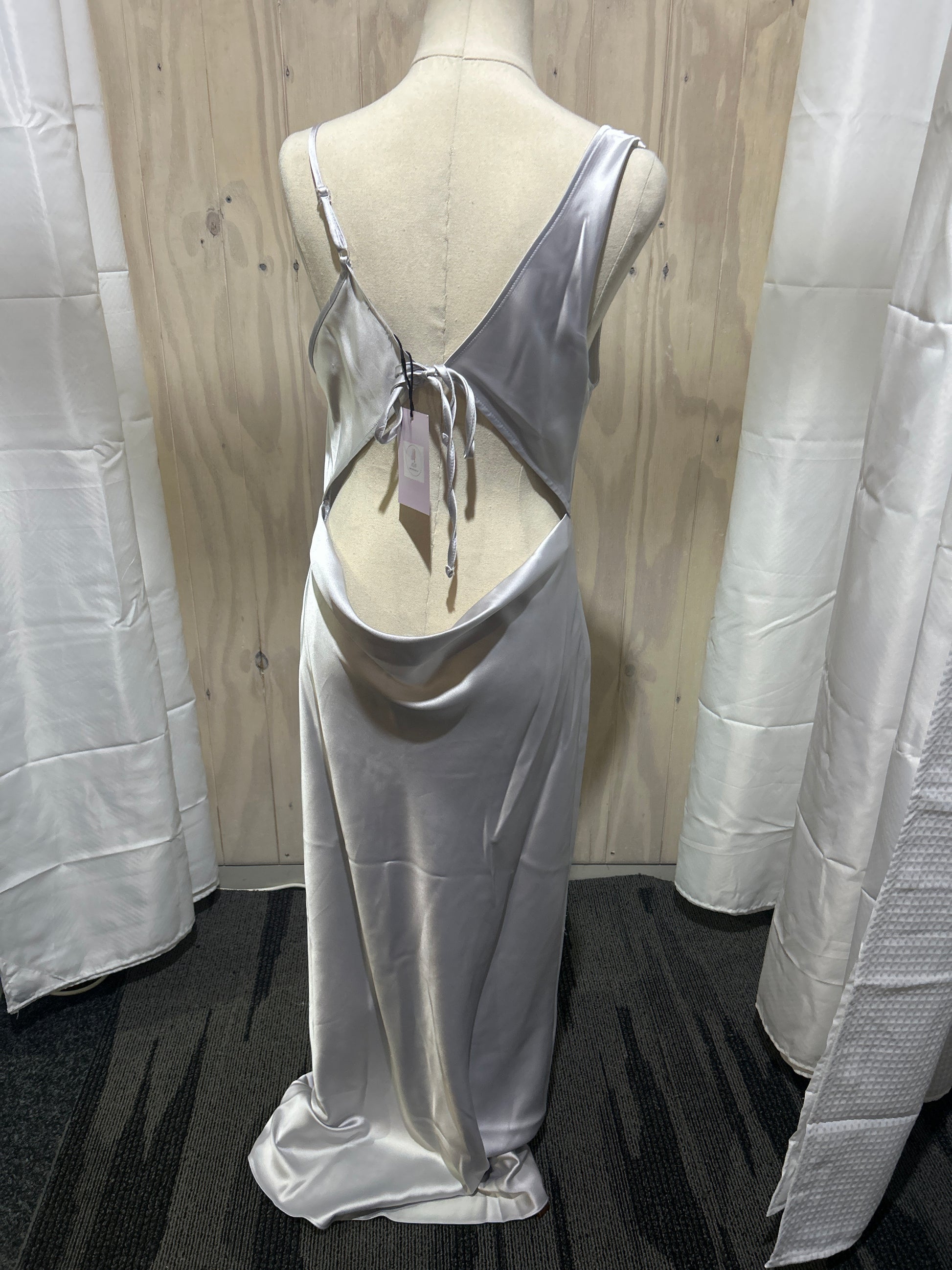 Shine bright in the Silver Luster Maxi, a stunning satin dress featuring an asymmetrical cowl neckline and a gorgeous tie-back detail that adds a touch of drama and elegance. Crafted in a beautiful silver shade, this maxi dress combines modern sophistication with timeless glamour.